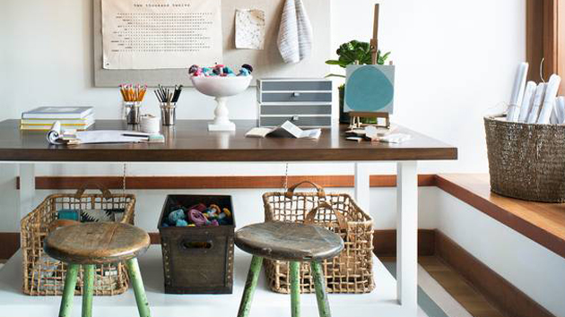 Se sei severo con i tuoi progetti fai-da-te, allora potresti voler avere uno spazio artigianale. In tal caso, il tavolo o l’isola dell’artigianato sarebbe al centro dello spazio e potresti avere spazio aggiuntivo sulle pareti. Usa contenitori, scatole o cestini per l’isola e puoi avere cassetti per i pensili.